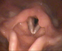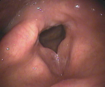 喉頭の声門下(声帯の下方)が炎症により腫脹して狭くなっています。呼吸困難の原因になったりします。