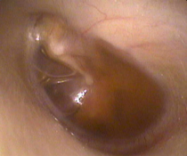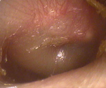 風邪や上気道の炎症が起こると鼻やのどにいる細菌やウイルスが、せきやくしゃみなどにより耳管をさかのぼって中耳に入って炎症を起こします。写真は中耳に膿が溜まったひどい場合です。
